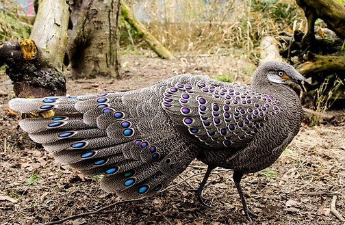 La FEMMINA pur essendo più piccola e con tonalità di bruno maggiormente definite, nell'insieme assomiglia molto al maschio. Tuttavia la colorazione risulta meno brillante e con un numero inferiore di ocelli distribuiti sulla livrea, che si presentano neri orlati di bianco e privi delle iridescenze metalliche che invece caratterizzano quelli maschili. Becco grigio scuro, iris grigiastro chiaro-lilla, zampe ardesia o grigio molto scuro con tarsi solitamente privi di speroni.